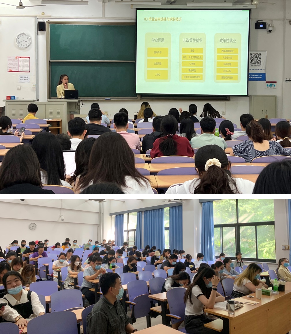 李萌从身份认知,毕业去向选择,保研考研和政策性就业的“上岸”技巧等方面为同学们开展了就业知识通识培训,帮助同学们了解各专业的社会需求情况,理清深造及不同形式就业的推进头绪,介绍了公司、公司在就业和生涯规划方面的指导帮扶工作体系,鼓励同学们以积极的心态面对压力,以主动的方式寻求资源。