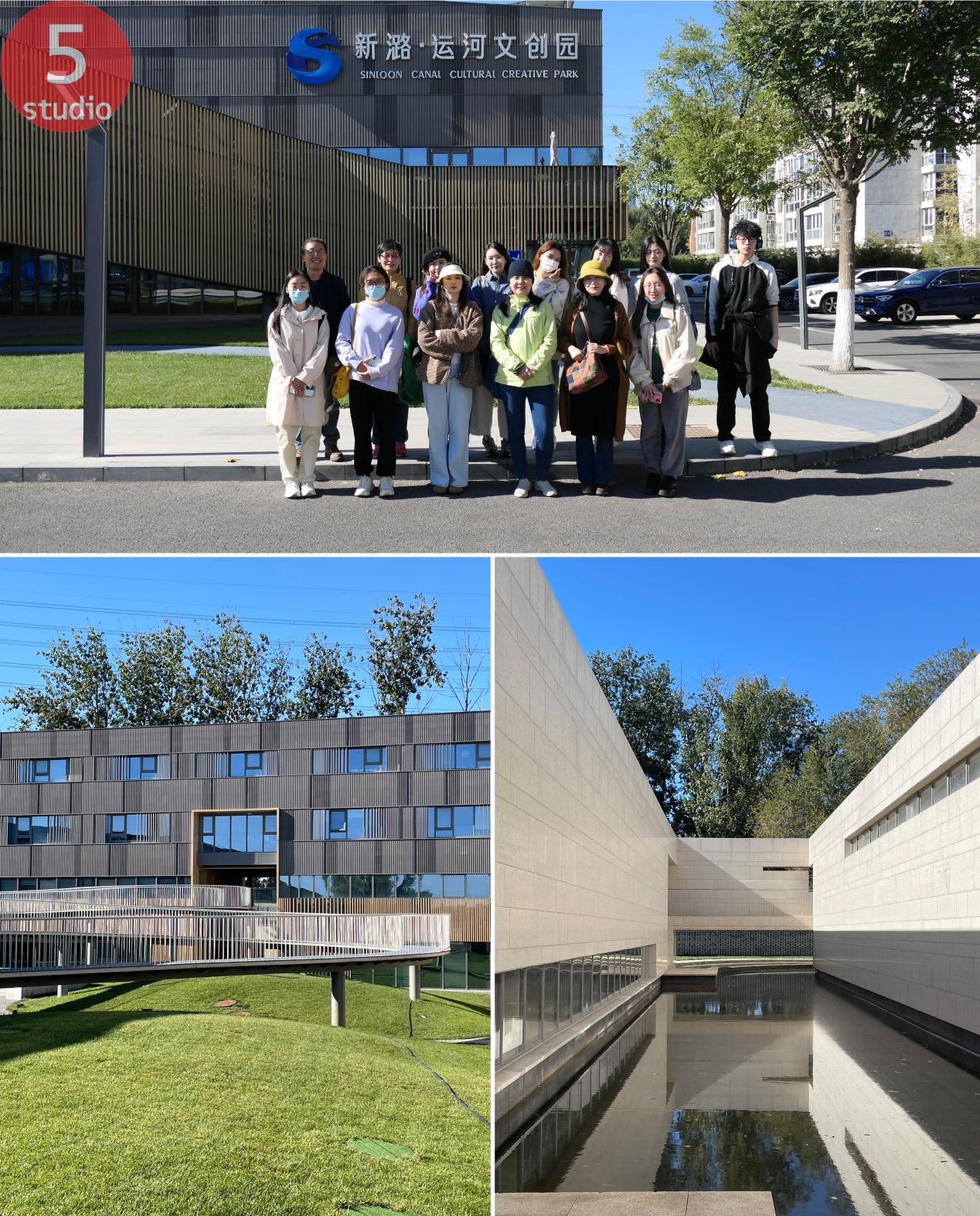 第五工作室团队早上八点半从公司门口集合乘坐大巴出发,沿线分别参观了新潞·运河文创园、千荷泻露桥及周边、城市绿心公园。