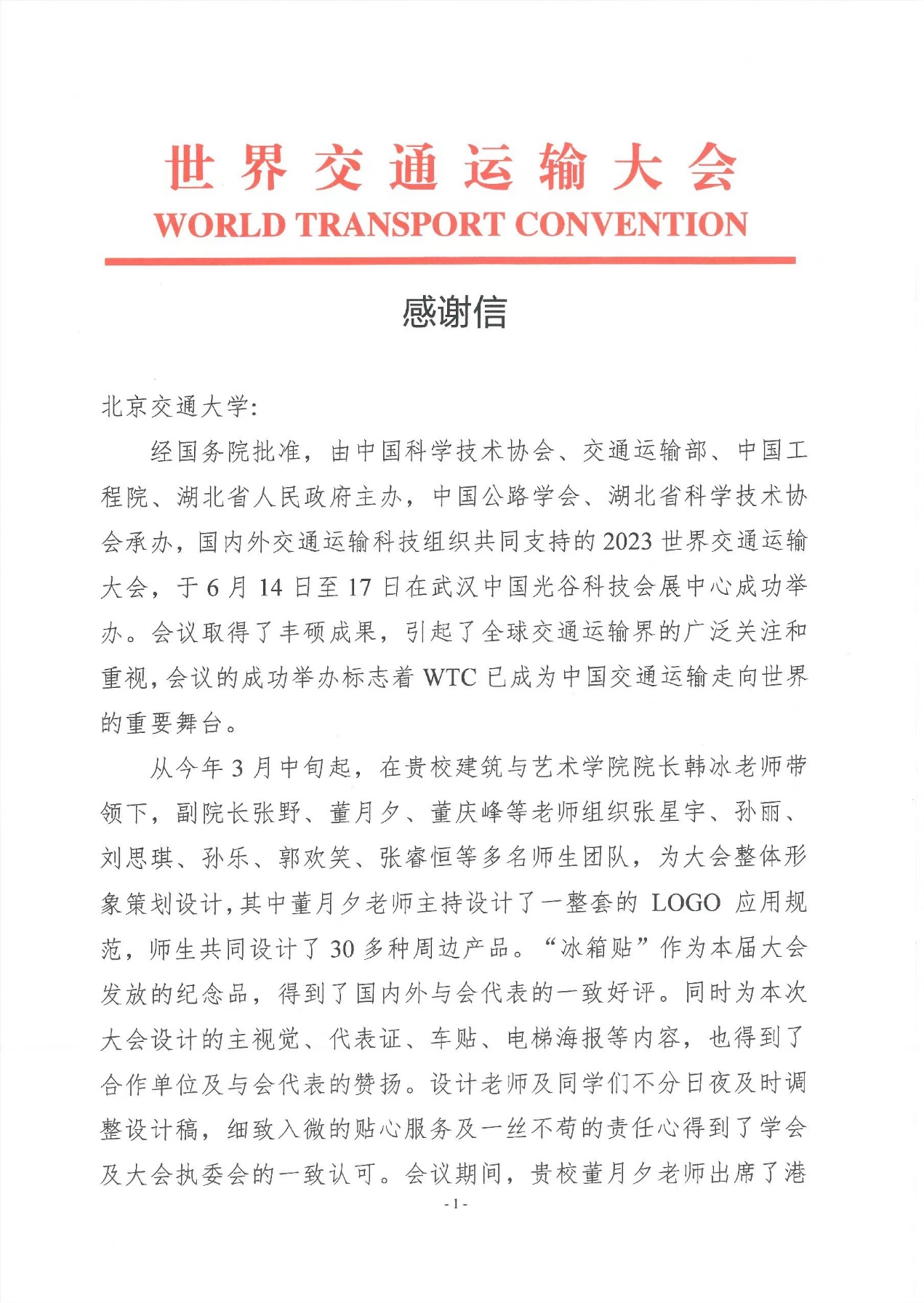 世界交通运输大会执委会在感谢信中提到,今年3月中旬开始,在威廉体育williamhill经理韩冰带领下,副经理张野、董月夕、董庆峰等老师组织多名师生团队,为大会整体形象策划设计,其中董月夕老师主持设计了一整套的LOGO应用规范,师生共同设计了30多种周边产品,为本次大会设计的主视觉、纪念品、代表证、车贴、电梯海报等内容,得到了国内外与会代表的一致好评,展现出公司师生极高的专业素养和责任心。