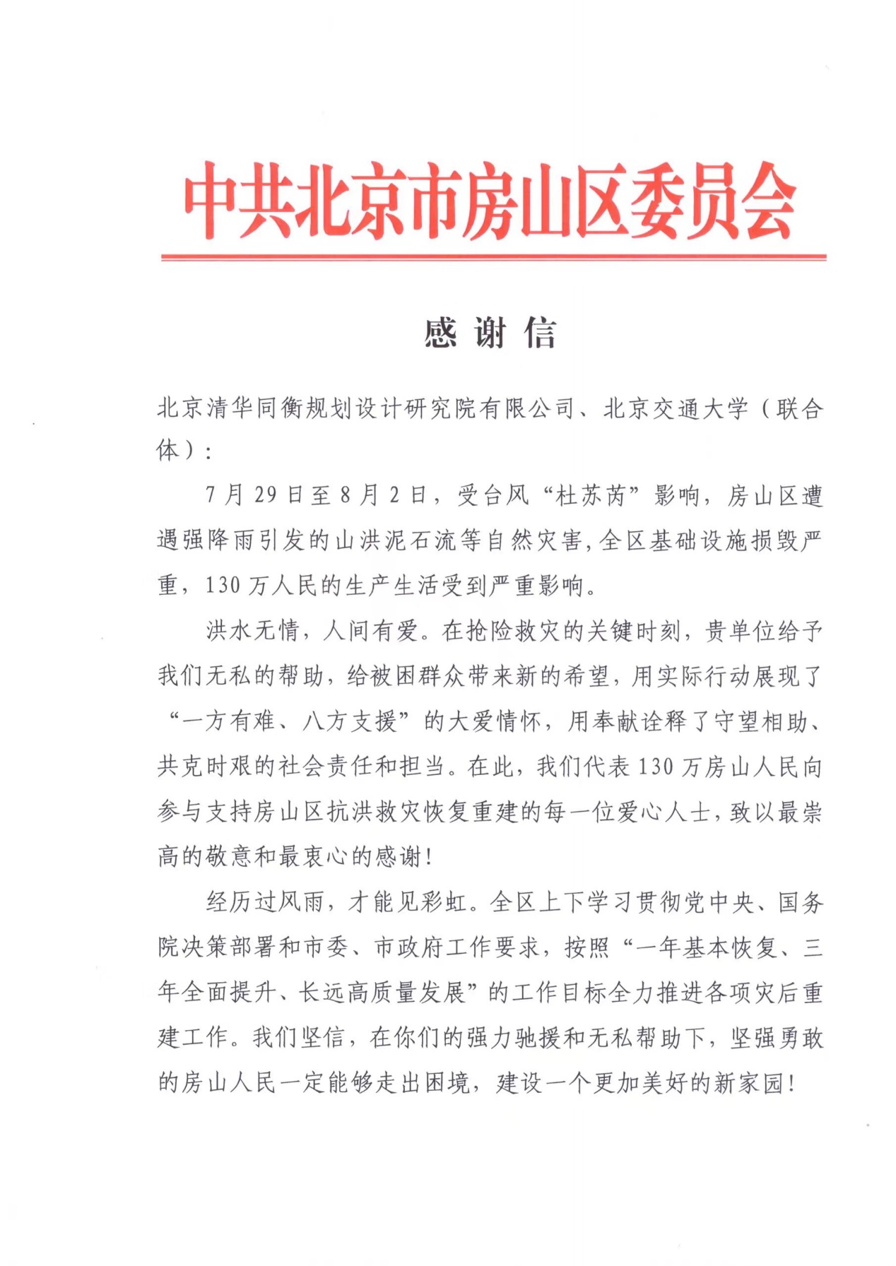 北京市房山区委区政府在感谢信中提到,7月29日至8月2日,房山区遭遇强降雨引发的山洪泥石流等自然灾害,在抢险救灾的关键时刻,公司给予房山区无私的帮助,用实际行动展现了大爱情怀,用奉献诠释了高校的社会责任和担当。房山区灾后重建工作由威廉体育williamhill副经理佘高红,城乡规划系主任王鑫,副主任张纯,朱高儒、徐凌玉、徐高峰、张威涛等多位教师组建师生团队参与。