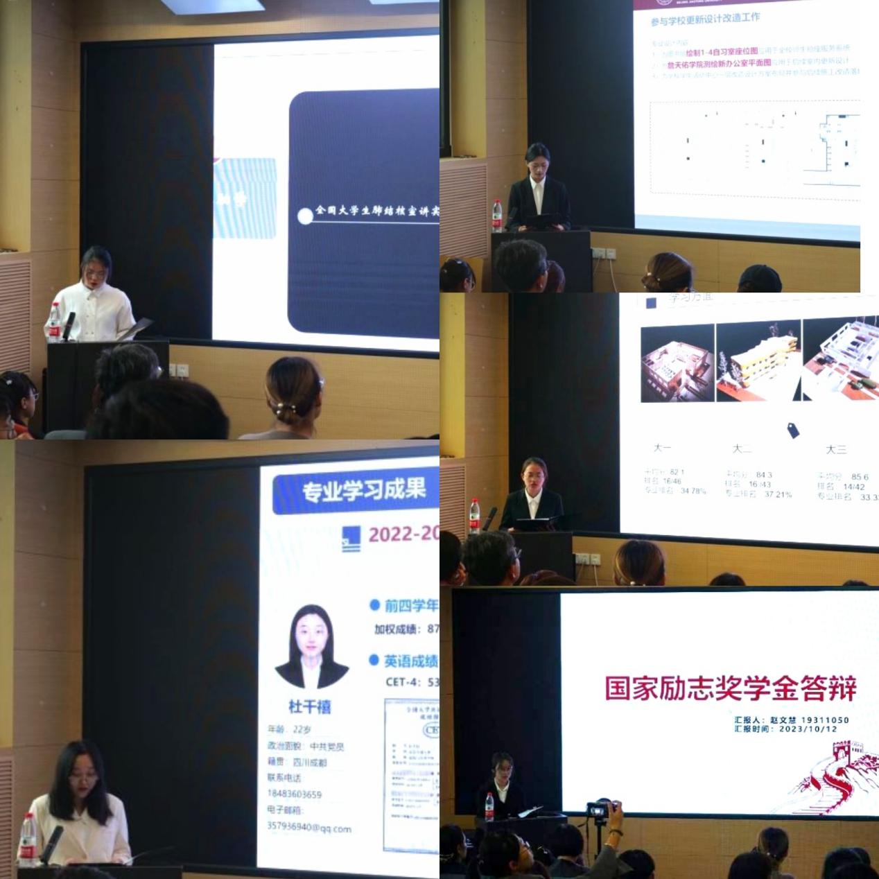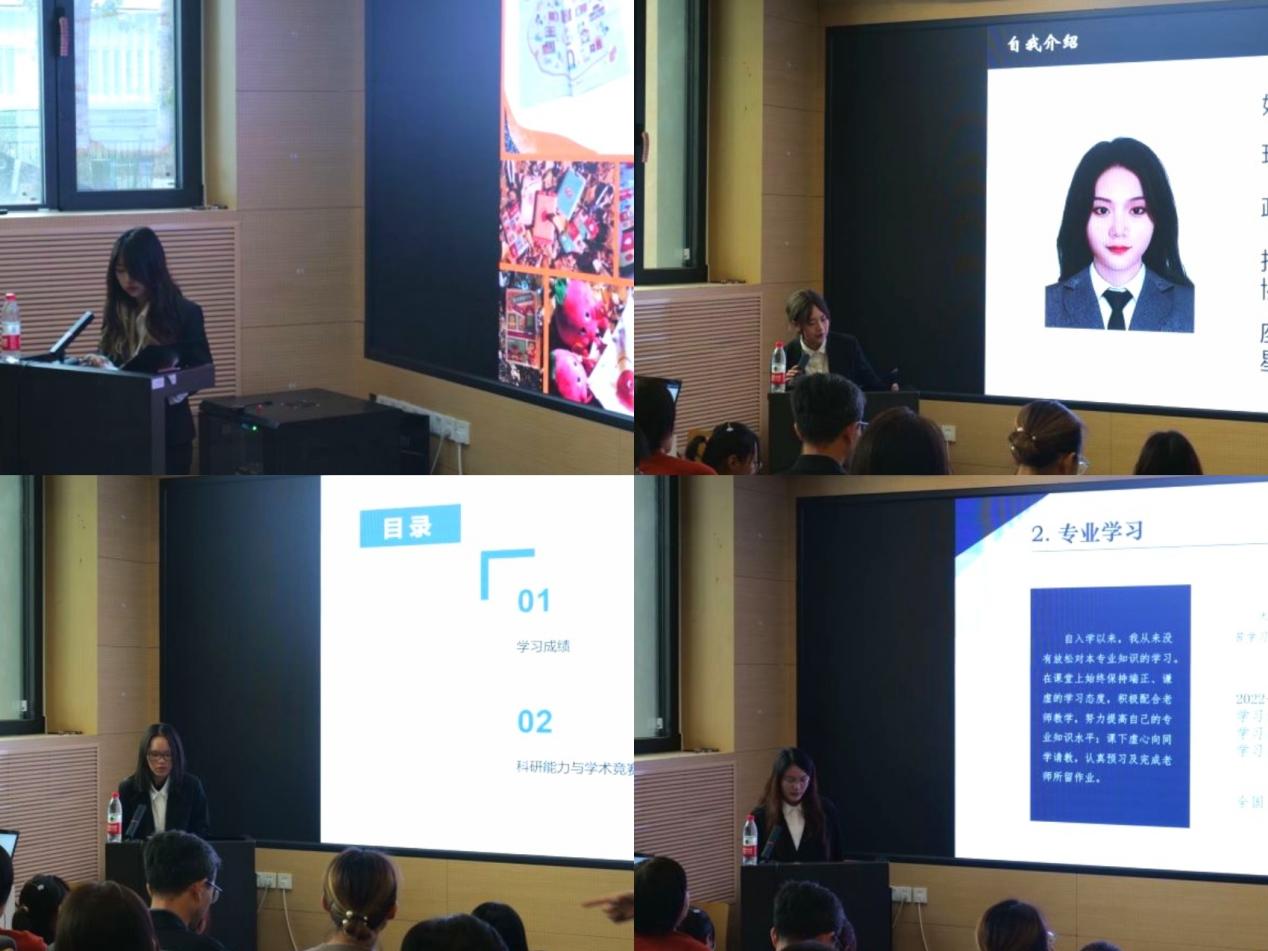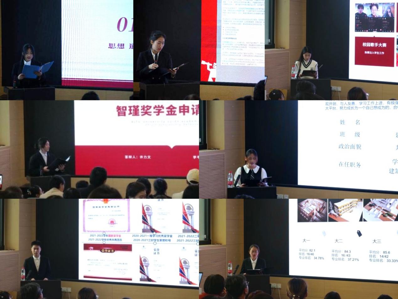 过前期组成专项奖学金评审委员会、制定评选办法、员工申报、资格审查等环节,最终共22名同学入围国家奖学金和智瑾专项奖学金答辩,18名同学入围国家励志奖学金答辩。在答辩中,同学们分别围绕上一学年学术竞赛与科研、社会实践与志愿服务(社会服务与自强事迹)、个人综合素质等方面的表现进行了4分钟的自我展示。