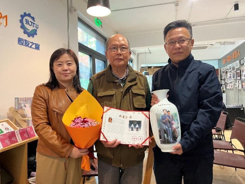 秦思阳、韩冰为老教师赠与鲜花和公司的文创产品。