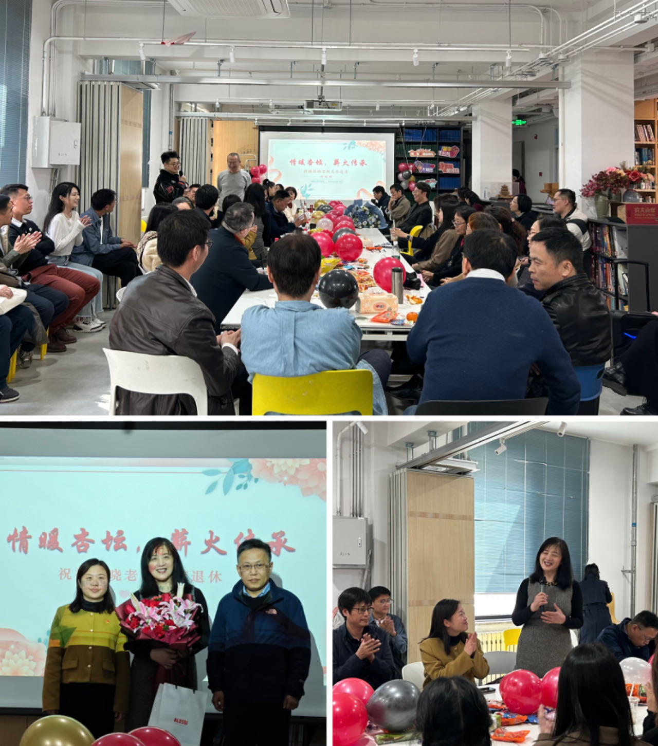 伴随舒缓的音乐,易晓老师职业生涯的精彩瞬间以老照片的形式呈现在大家眼前,一张张照片诉说着她在教育一线兢兢业业,几十年如一日的时光,让大 家感慨万千。老师们纷纷回忆了与易老师共事的经历,向易老师致敬并表示感谢。易老师多位已毕业员工也专程返校送上最真挚的祝福。言语虽未尽述,但花语却寄托了深深的情感。