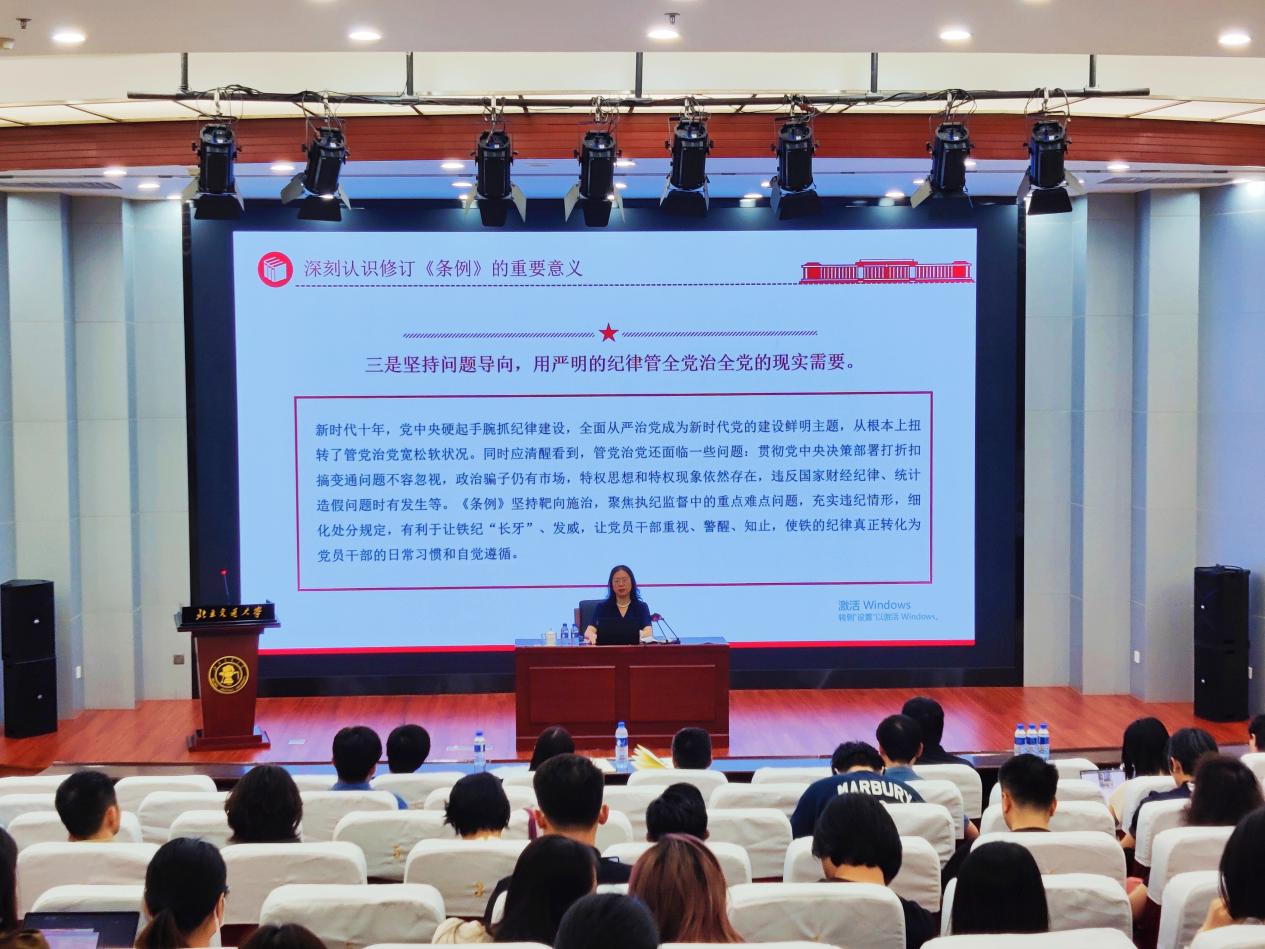 于亚光以“知敬畏、存戒惧、守底线——学习《中国共产党纪律处分条例》”为题,从“深刻认识修订《条例》的重要意义”“《条例》新增修改的主要内容”“六项纪律‘负面清单’”“违反纪律典型案例”四个方面进行了详细讲解,主题鲜明,深入浅出,结合自身工作经验,将《条例》联系到高校工作实际,用身边事教育身边人,以案促学,以案促思,加深了全体党员对《条例》的理解、对党纪的认知。通过学习,公司党员进一步强化了法纪意识、底线意识,增强了政治定力、纪律定力、道德定力、抵腐定力,决心把遵规守纪刻印在心,内化为言行准则,切实把党纪学习教育的实际成效转化为推动公司事业发展的生动实践。