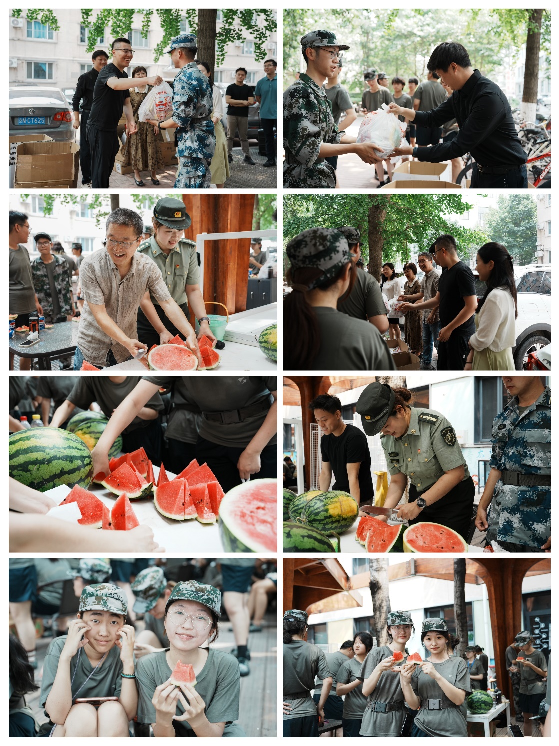 刘萍为参训员工代表送上慰问品,并对本次军训的带训辅导员、辅导员助理表示亲切慰问。班主任代表为全体参训员工发放了解暑水果和慰问物资,让同学们在炎炎夏日中感受一丝清凉与欢乐,坚定了完成好军训任务的决心。