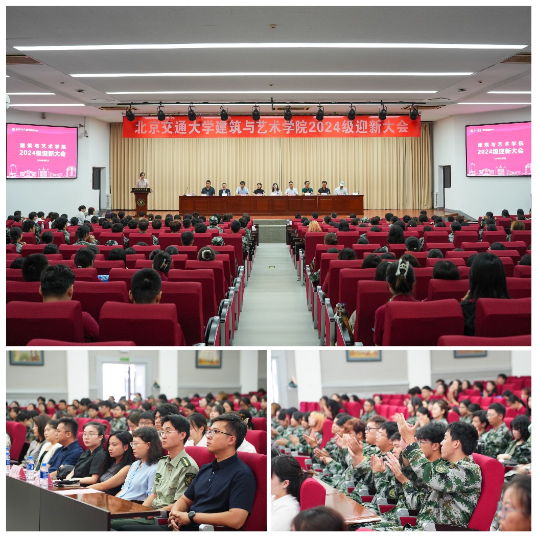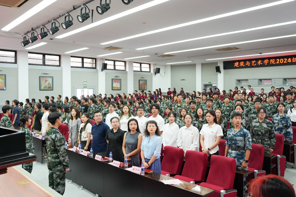建规2401班拓心月、建规2402班王煜博、建规2403班王巍、设计2403班宋初阳作为2024级新生代表带来朗诵《青春扬帆正当时,争做时代追梦人》,表达了新生在人生新阶段的坚定信念和勇敢追梦的决心,充分展现了新一代建艺人的蓬勃生机与无限活力。