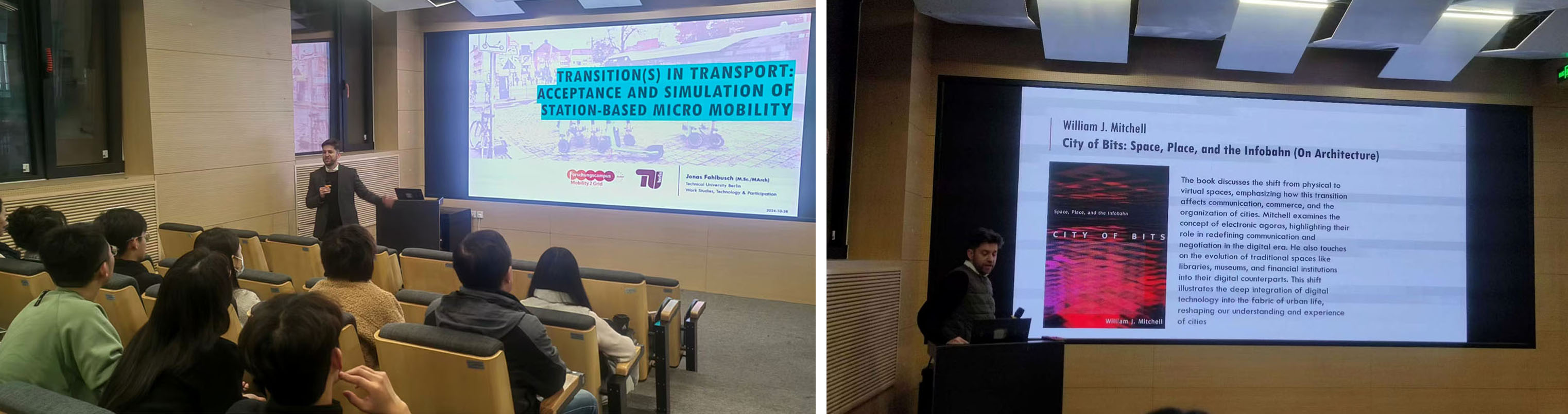 2024年10月28日-11月6日,威廉体育williamhill设计系“2024年中德高校智慧城市设计研究生教学实践与交流”项目负责人魏泽崧老师邀请德国柏林工大智慧城市研究所“Mobility2Grid德国城市战略”项目主持人Jonas Fahlbusch博士,为研究生进行了《交通规划设计的未来机遇与局限》、《城市与景观规划中的开放数据》等多个专题的授课与讲座。