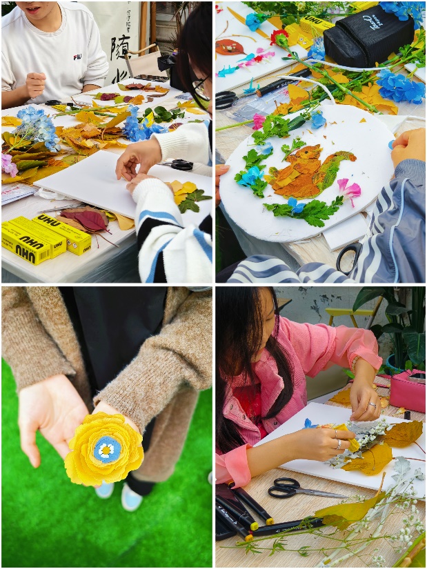 落叶象征着季节的轮回与生命的延续,鲜花代表着生命与绽放,艺术创作则为参与者提供了一个安全的空间,去表达内心的情感与思考。本次拼贴疗愈活动,参与者通过创作与分享,感受自然,享受创作,迎接内心的平和,用自然的色彩,疗愈心灵。