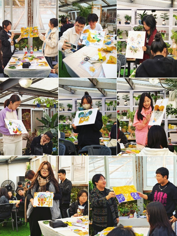 破冰结束后,大家共同前往绿色空间站,张京引导同学们在充满绿色植物的环境下,放松身心,用心创作。同学们伴随着优美的音乐,在朋辈导师的引领下,运用修剪、拼装、粘贴、绘画等手法结合自己的心情制作成一幅幅充满大自然气息的秋日拼贴,感受落叶的温暖与释然。创作完毕后,同学们纷纷展示自己的作品,分享自己的创作理念,讲出自己的所感所想。