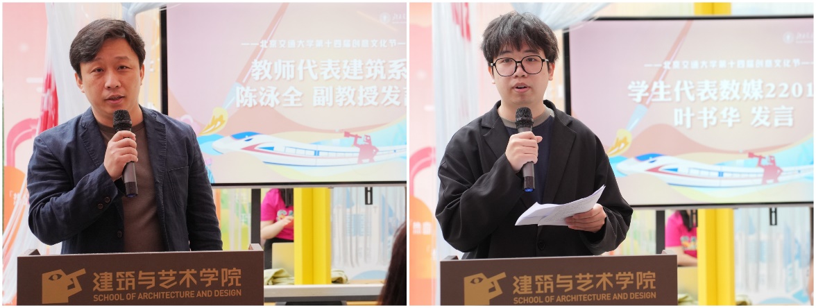 建筑系副教授陈泳全代表指导教师发言,分享了10年来带领员工开展建造节的体验和感受;数字媒体艺术2201班叶书华代表参与员工发言,分享了自己对当今艺术从业者如何将技术化为情感表达媒介的使命和责任的思考。
