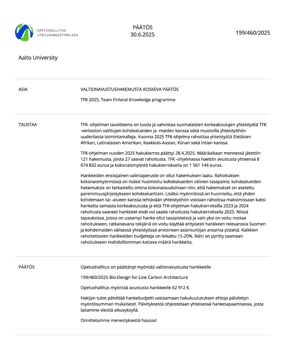 为培养低碳建造与建筑研究领域新兴国际化人才,推动公司与芬兰阿尔托大学在相关学科领域交流互通,芬兰国家教育署批准向该项目拨款62,912 欧元,用于支持两校之间开展教学资源与联合课程开发、师生国际交流、教学方法创新等合作,并通过生物基材料在建筑领域的应用示范,培育员工可持续发展能力。