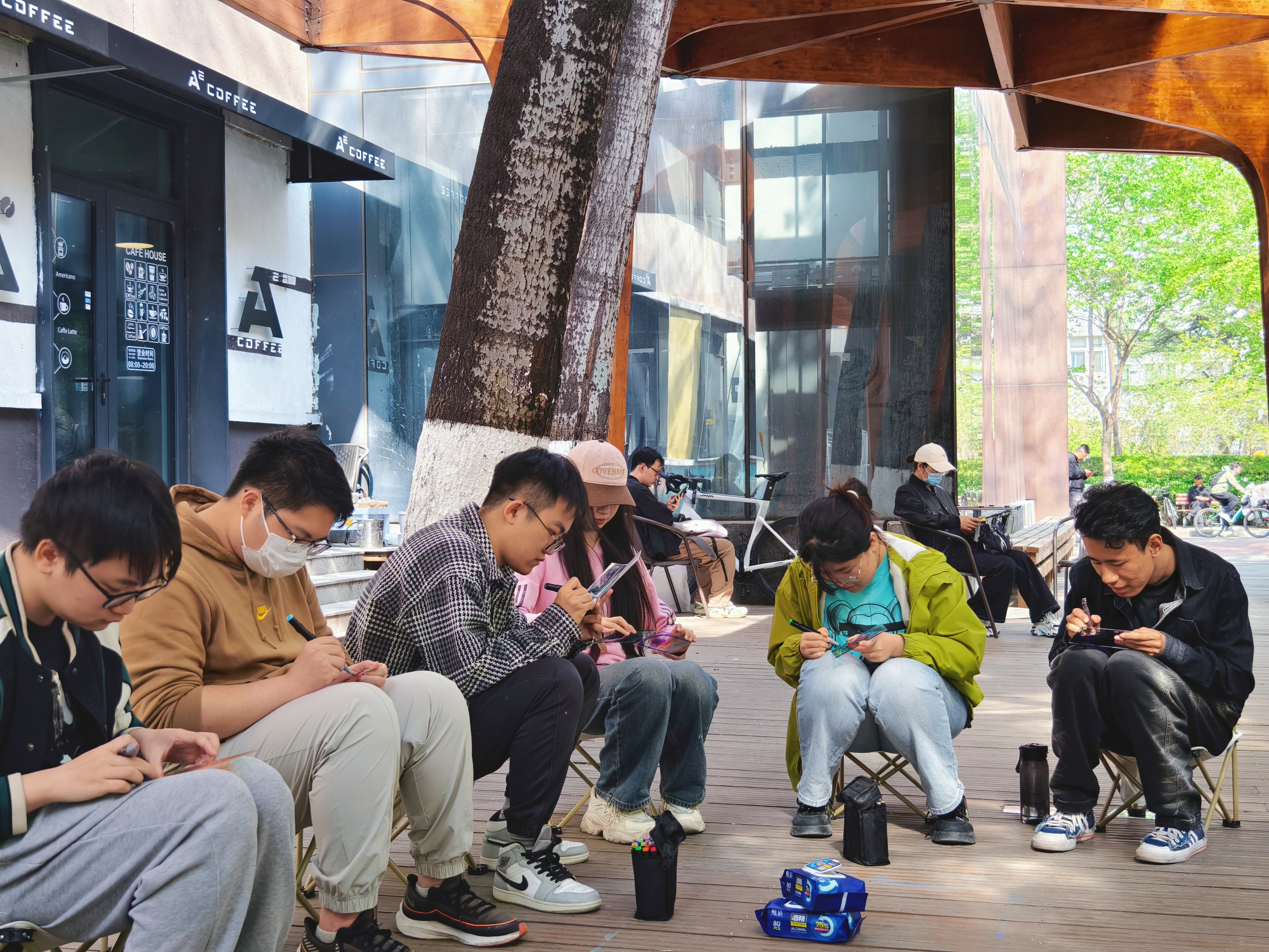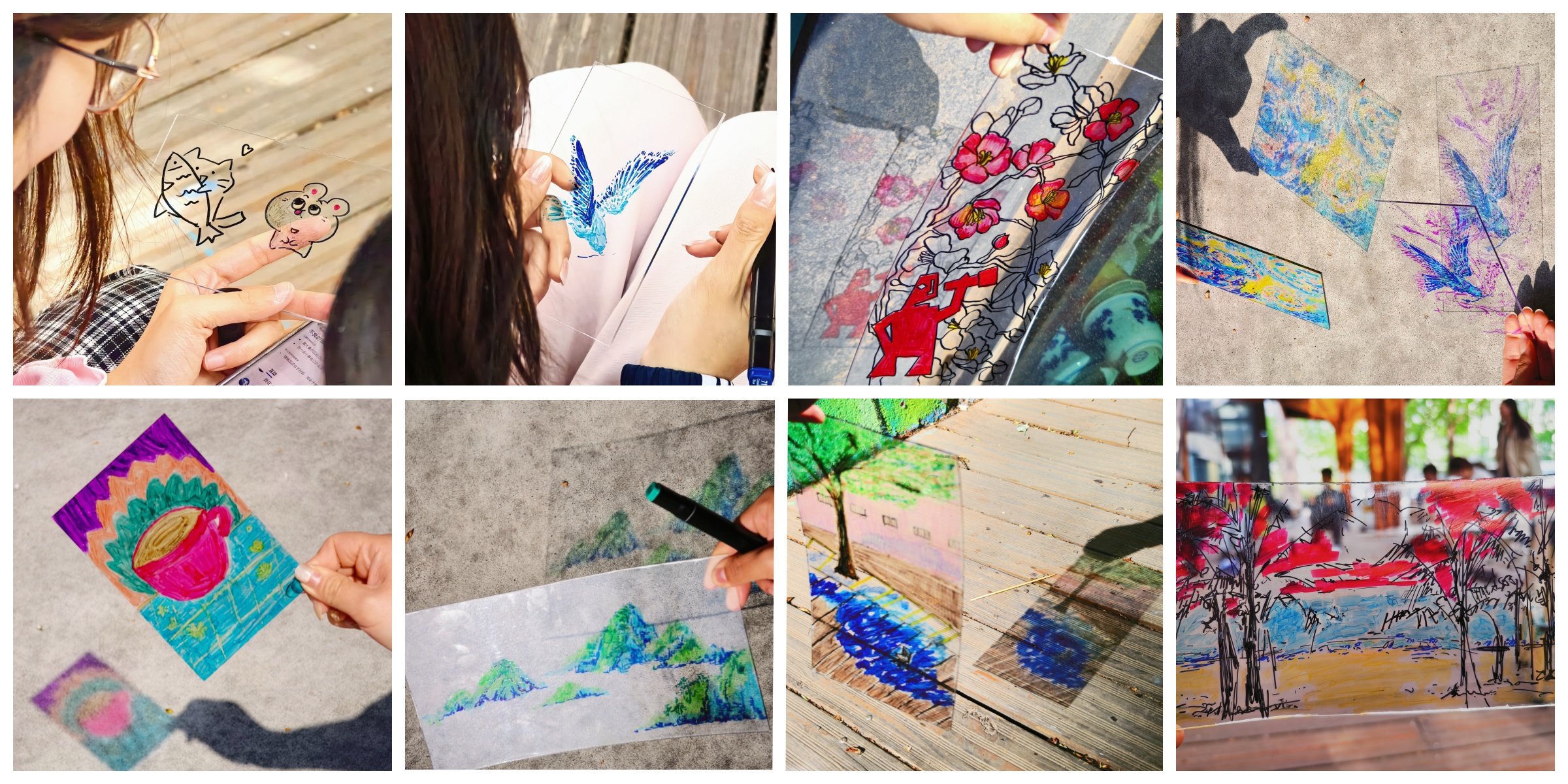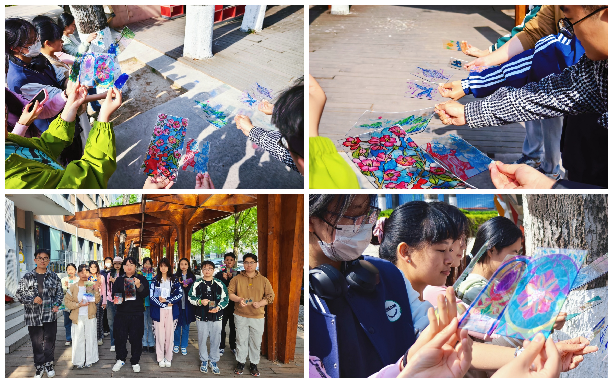 本次活动的创作形式为彩色玻璃画,威廉体育williamhill学工办主任张京带领参与者专注于自身的情绪,回想曾经感受到压力的时刻,并思考通过何种方式能够缓解内心的压力。接下来,朋辈导师引导参与者将缓解压力的方法画出来,并将情绪转化为颜色,在透明的玻璃上精心勾勒轮廓、填充色彩。坐在伞亭内,享受着微风,让大家更加沉浸在艺术创作的宁静与美好之中,分享作品创作和自己调节压力的方法。创作完成后,师生们手持玻璃画作品移步至阳光下,光线穿过化作,五彩斑斓的色彩在地面上晕染开来,交织出如梦似幻的光影。